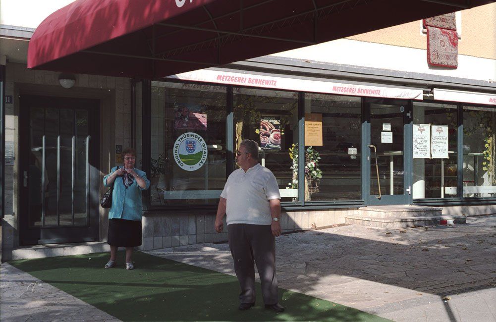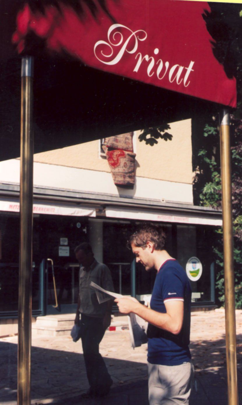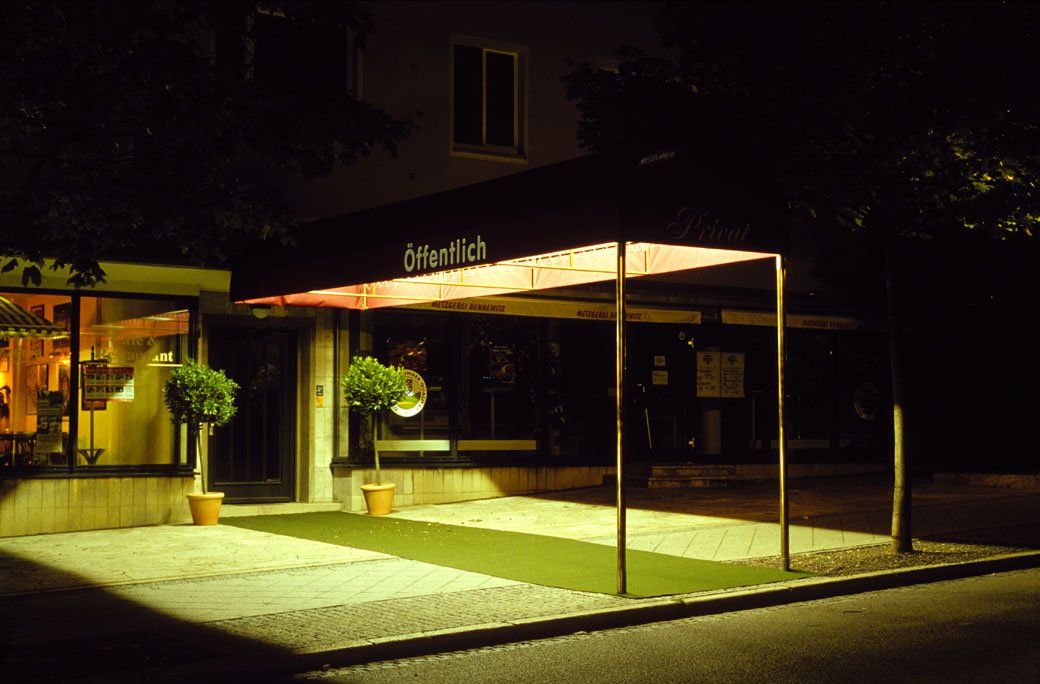 A residential building from the sixties, near to the train station, one you would never notice, becomes a „place“. The temporary installation of the noble red canopy provokes a modification of the whole urban situation. The exact simulation and reproduction of a luxurious canopy, similar to those ones you find around Central Park in New York, is now transferred to a simple building with no special, outstanding position. For Weimar, the hierarchical connotation of these construction, which divide public space from private or extend the private into the public, denotes questions that were inconceivable in former GDR-times. A society formed by socialist philosophy can hardly imagine the hierarchization of a public sidewalk. Now, after 14 years, things have changed. The privatization of Weimar has been concluded, money from the west has restored the town and set new balances of power. During GDR times, no one had to be either private or public, walk either „straight through“ or „from the side“. New York in Weimar. The canopy establishes a new quality of space, a space full of questions. In the meantime, the inconspicuous house becomes a place of attention. Transit through this passage of the „private“ raises the visitor to another level. The lonesome inhabitant coming home late feels privacy, meanwhile the flaneur going down the street crosses the public sphere. At this moment, a process of reflection about one’s own position/role in the public context may start. One’s own life as a citizen / citoyen and as a private person becomes the subject of discussion, and the transformation of a non-place into a place has started. by Katharina Hohmann