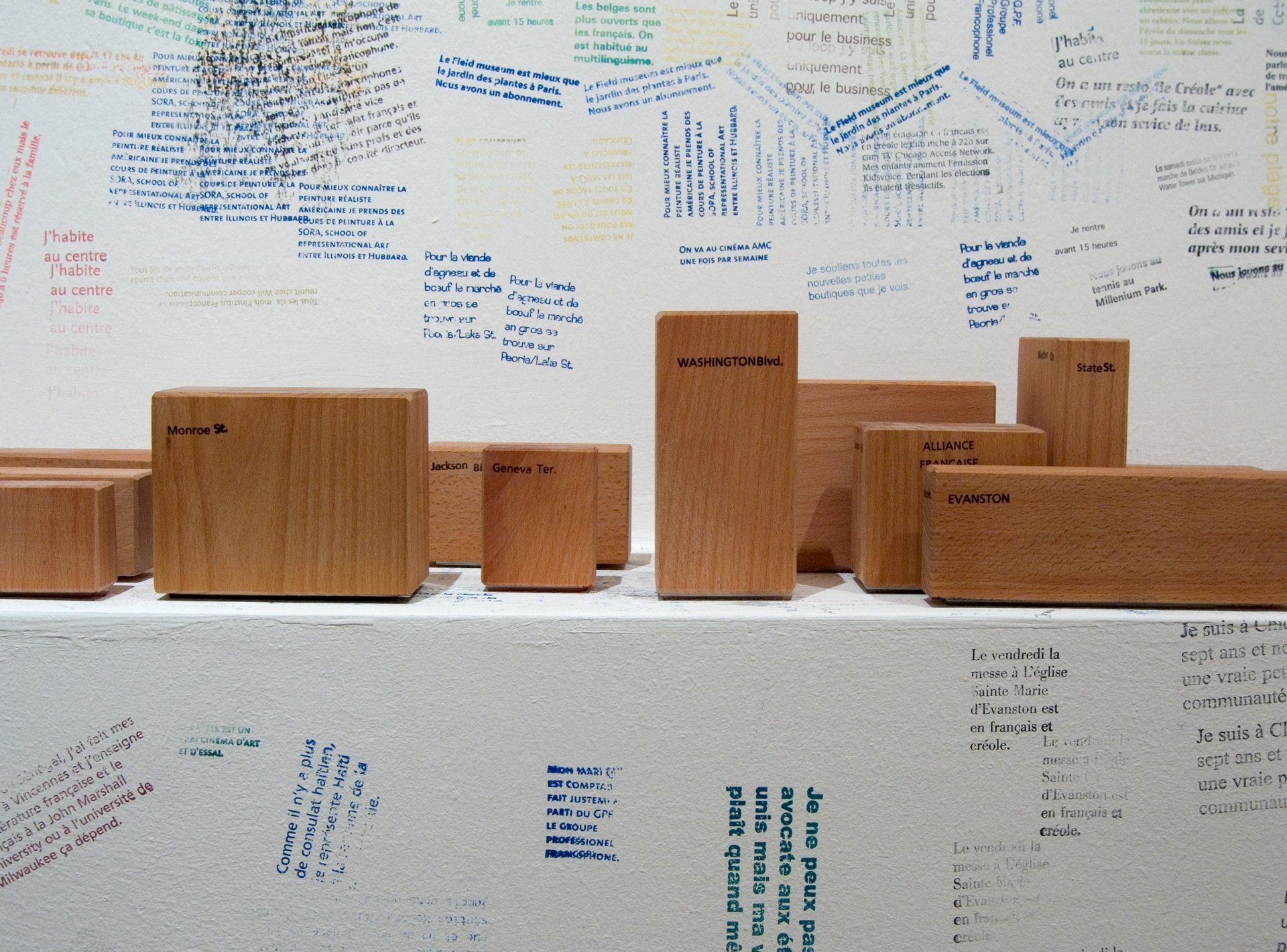 The installation French Stamps, consists of three hundred rubber stamps bearing quotations from members of the Francophone community of Chicago appertaining to various places in the city. As a result of the visitor‘s participation, an enormous map is gradually produced on the gallery wall, relating to the topography of Chicago; it becomes a true register of individual stories within a speech community.