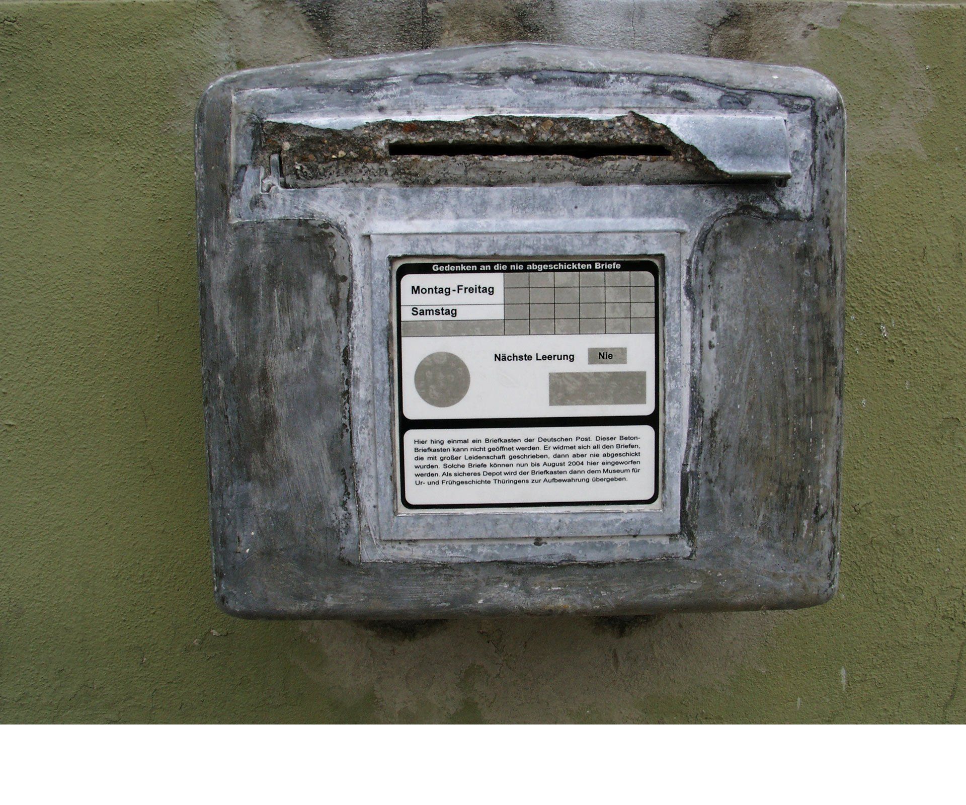 In March and April 2003 the German postal service (Deutsche Post) removed several thousand mail boxes all over Germany. Sylvie Boisseau placed a mailbox out of concrete from June 2003 until August 2004 exactly at the place where, three months before, a mailbox of the German Post was removed. Though you can put letters in, they will never be collected because our concrete mailbox is dedicated to those letters, which have been written in passion, but never been sent to anybody. During its use the mailbox became an emotional charged storage place, containing the most private in public space. It was meant as a personal relief, for a tabula rasa, a new beginning. This concrete sarcophagus can neither be opened nor does anybody know how many letters are in there. As a safe depot the mailbox was given, along with its contents, to the archeological museum of Thuringia.